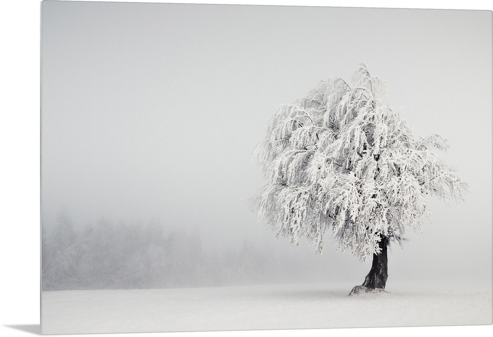 <p>A lonely tree stands in a winter landscape, its branches heavy with snow.</p>