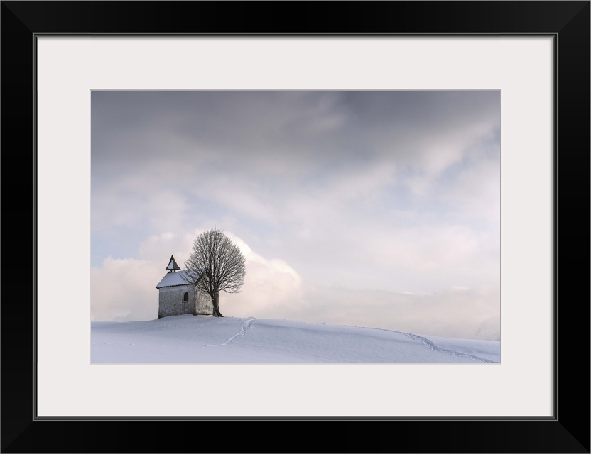 <p>A small chapel with a tree sit on a hilltop covered in fresh snow in winter.</p>