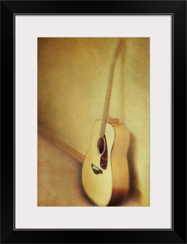 <p>Guitar leaning a against a wall.</p>