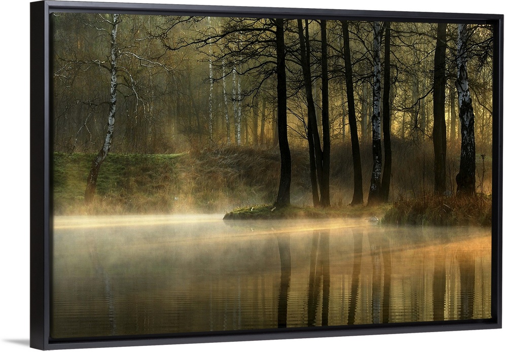<p>Mist rising from a pond in a forest with morning light filtering through the trees.</p>