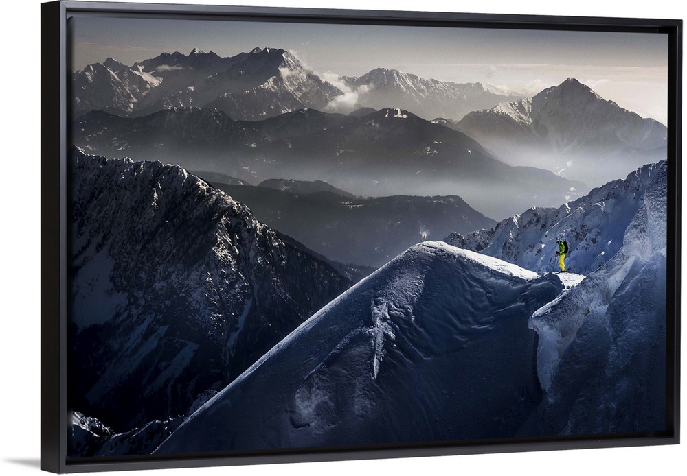 <p>A skier pauses at the top of a mountain, with peaks of neighboring mountains in the background.</p>