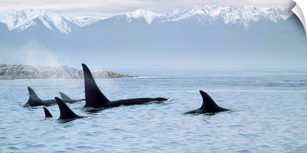 <p>A group of whales travel through the water, the lands around them covered with snow.</p>