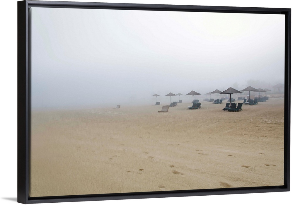 <p>Landscape photograph of a sandy beach covered in fog and beach chairs with umbrellas.</p>