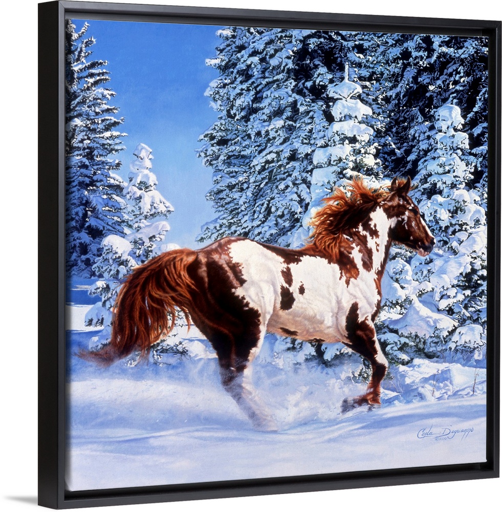 <p>Square, large wall picture of a brown and white horse kicking up snow as he runs through a winter landscape, tall, snow covered trees in the background.</p>