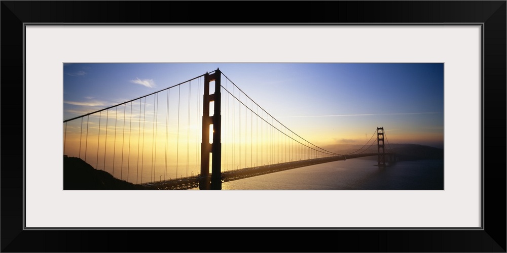 <p>Panoramic, angled photograph of the Golden Gate Bridge, silhouetted as the sun rises in the sky over California.</p>