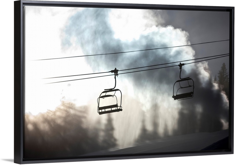 <p>Silhouette of a chairlift on a ski hill with man made snow from snow gun backlit by the sunlight, Copper Mountain Resort; Colorado, United States of America</p>