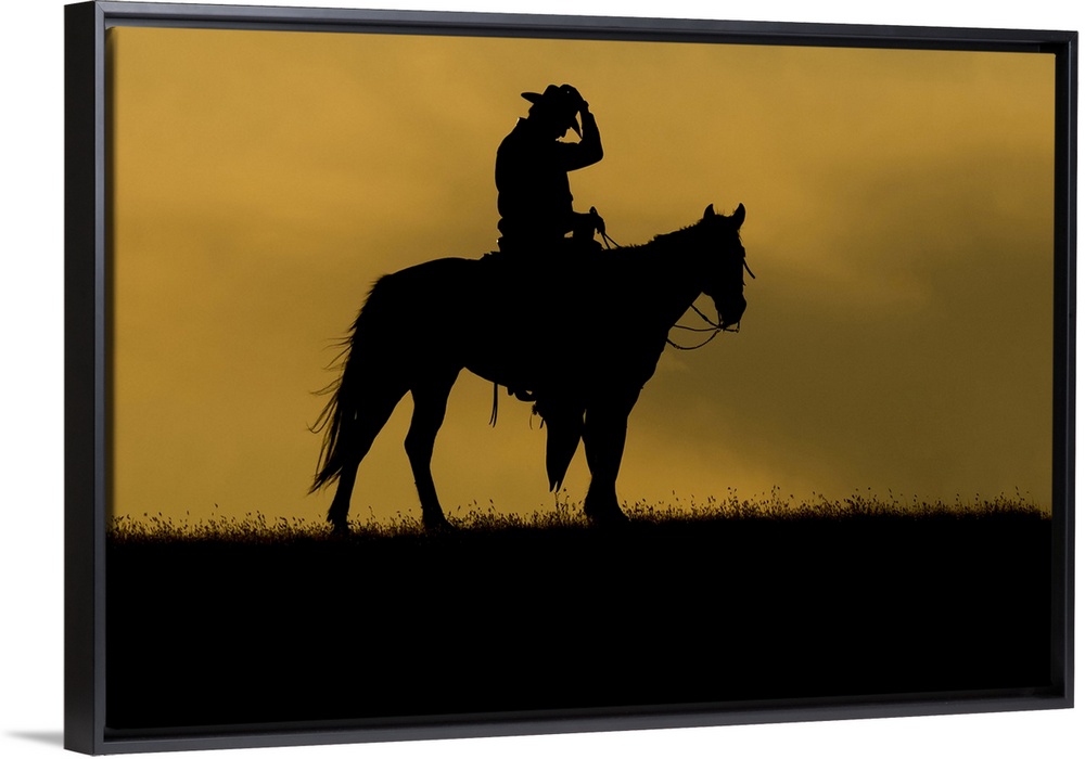 <p>Silhouette of a cowboy on a horse against a sky of golden cloud at sunset; Montana, United States of America.</p>