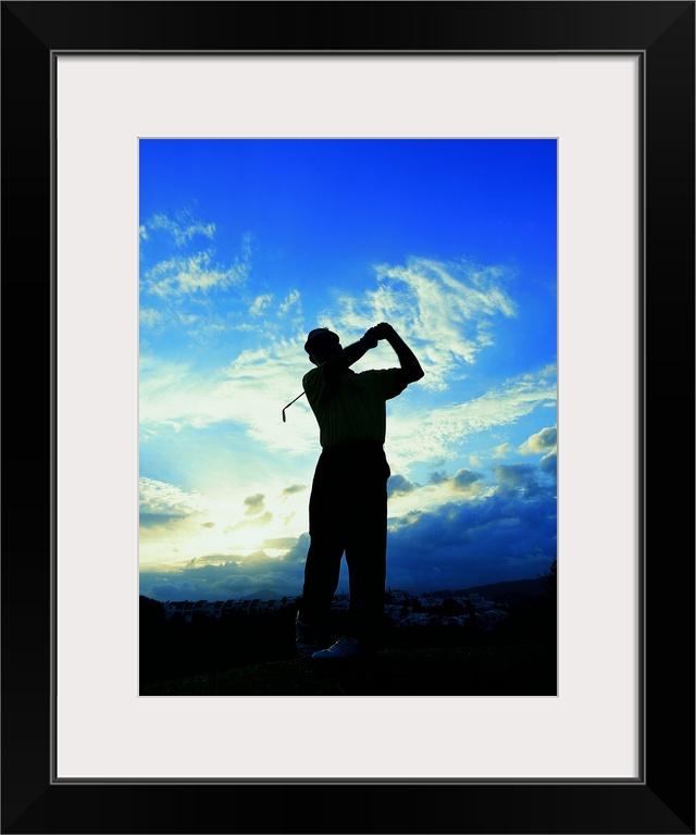 <p>silhouette of a golfer after a swing</p>