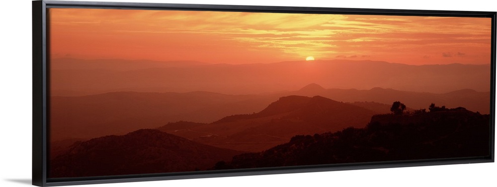 <p>Giant panoramic photo on canvas of layers of Italian hills with a setting sun in the distance.</p>