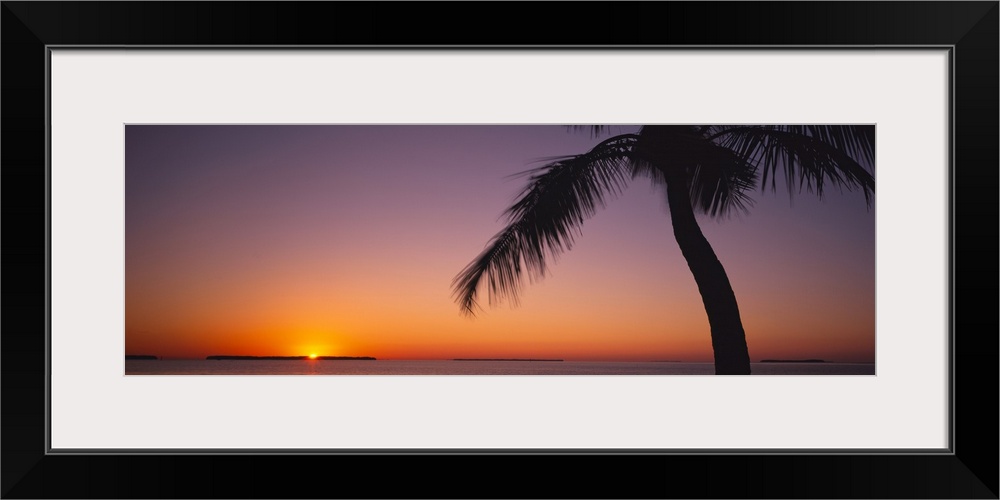 <p>The last bit of sun is peaking over the horizon illumniating the sky in brilliant oranges and purples as the silhouette of a lone palm tree overlooks the calm ocean.</p>