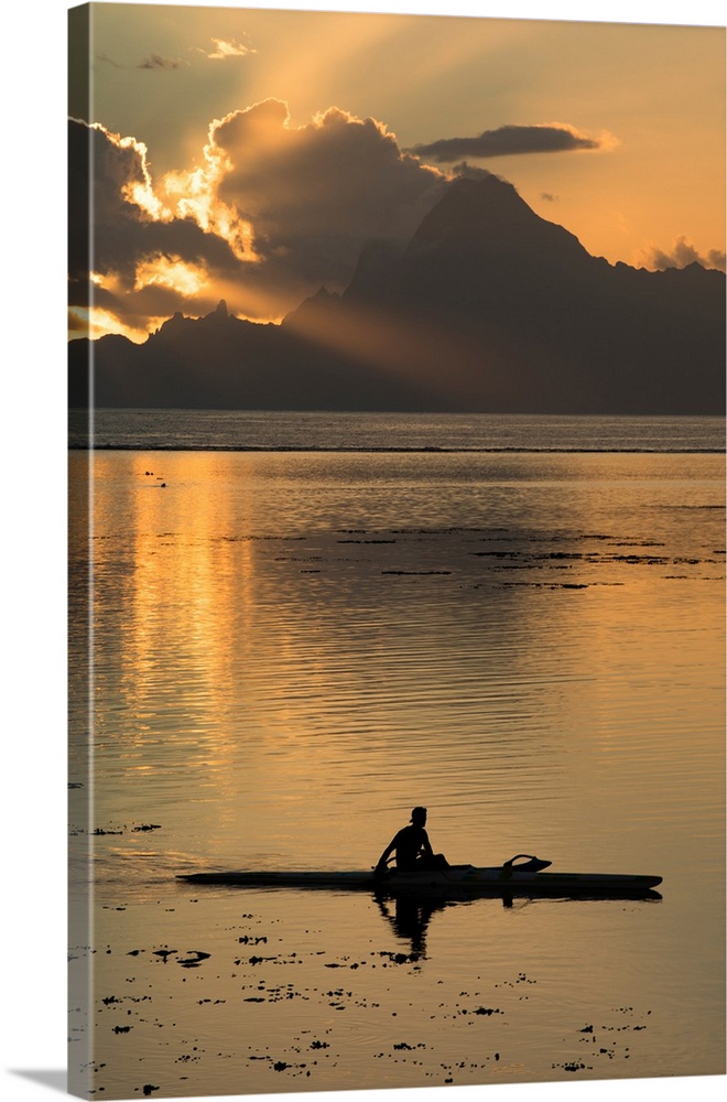 <p>Silhouette of a person canoeing in the Pacific Ocean, Moorea, Tahiti, French Polynesia</p>