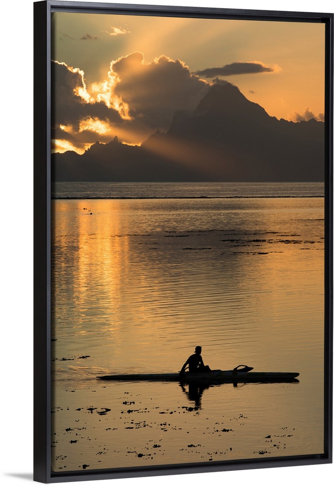 <p>Silhouette of a person canoeing in the Pacific Ocean, Moorea, Tahiti, French Polynesia</p>