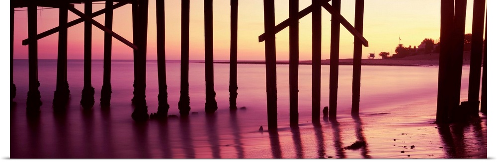 <p>Silhouette of a pier at sunrise, Malibu Pier, Malibu, Los Angeles County, California, USA</p>