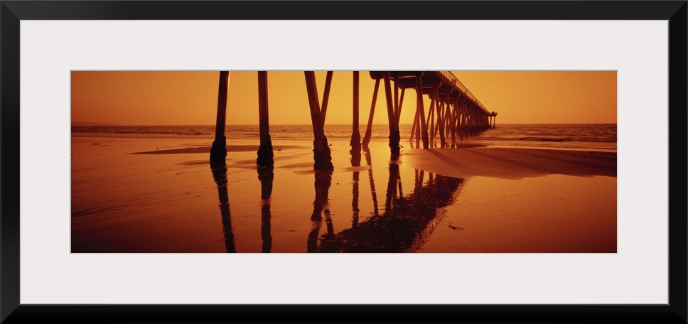 <p>Big, panoramic photograph taken at an angle of Hermosa Beach Pier during a golden sunset, in Hermosa Beach, California.</p>