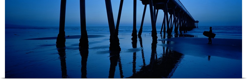 <p>Big, landscape, panoramic photograph looking upward at an angle toward the Hermosa Beach Pier in California, at dusk. The silhouette of a surfer is next to the pier.</p>