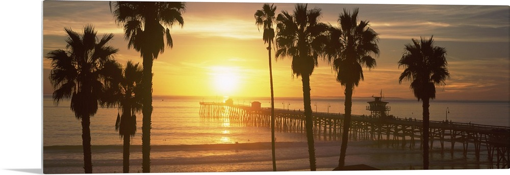 <p>Panoramic photograph of dock stretching into ocean at sunset with palm tree silhouettes in the foreground.</p>