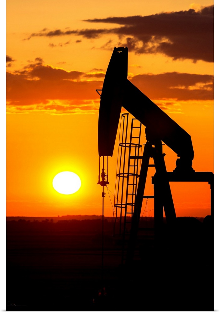 <p>Silhouette Of A Pump Jack At Sunrise With A Colorful Orange Sun, Clouds And Sky; Alberta, Canada</p>