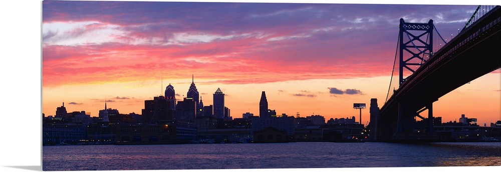 <p>View from the shoreline under the bridge of pastel-colored clouds over the city skyline at dusk.</p>