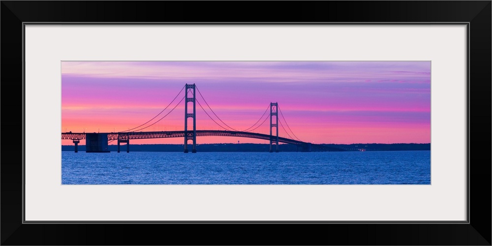 <p>Panoramic photograph shows a long overpass spanning a large body of water and connecting two portions of a state in the Midwestern United States. The overpass is set against the dimming light of the sky.</p>