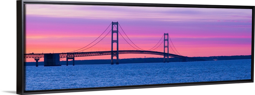 <p>Panoramic photograph shows a long overpass spanning a large body of water and connecting two portions of a state in the Midwestern United States. The overpass is set against the dimming light of the sky.</p>