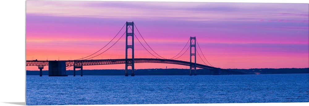 <p>Panoramic photograph shows a long overpass spanning a large body of water and connecting two portions of a state in the Midwestern United States. The overpass is set against the dimming light of the sky.</p>