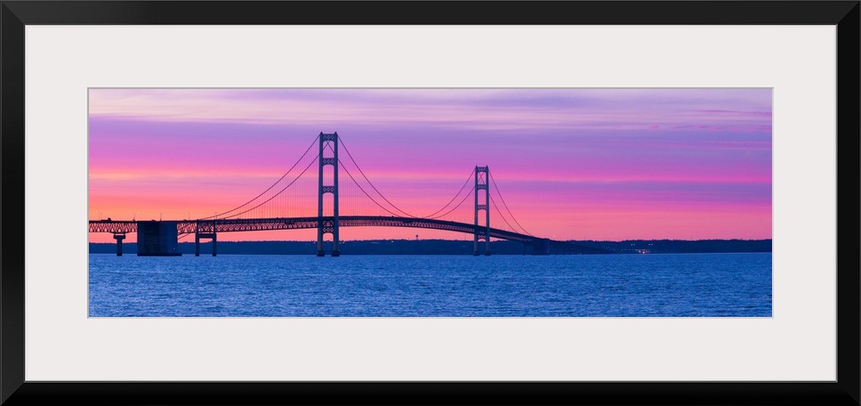 <p>Panoramic photograph shows a long overpass spanning a large body of water and connecting two portions of a state in the Midwestern United States. The overpass is set against the dimming light of the sky.</p>