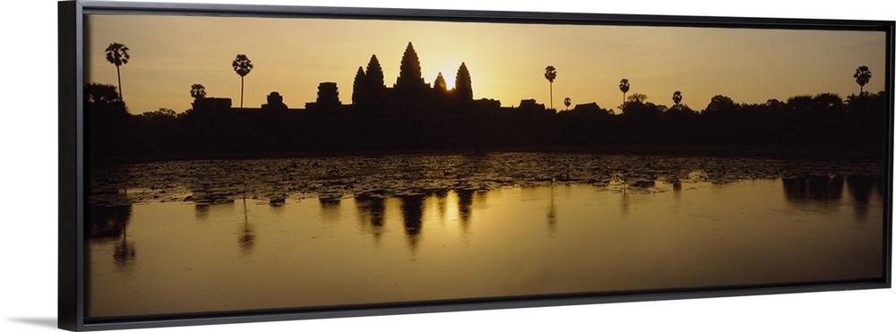 <p>A skyline in Cambodia is pictured from across a body of water and silhouetted by the sunrise just behind it.</p>