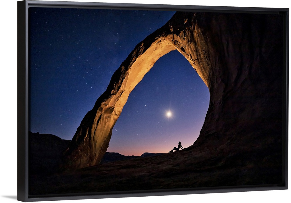 <p>Silhouette of a woman under Corona Arch in Moab, Utah</p>