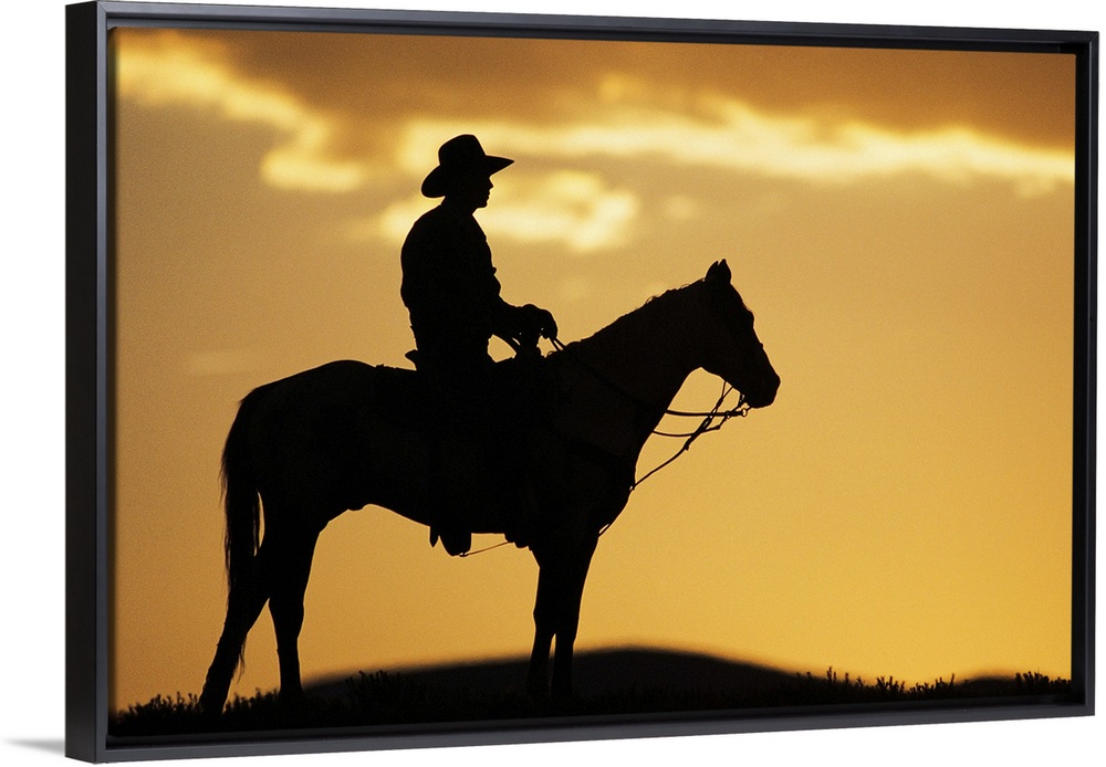 <p>Silhouette of cowboy on horseback at sunset or sunrise</p>