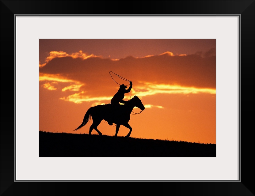 <p>The sunset sky silhouettes a cowboy on his horse as he swings his rope above his head.</p>