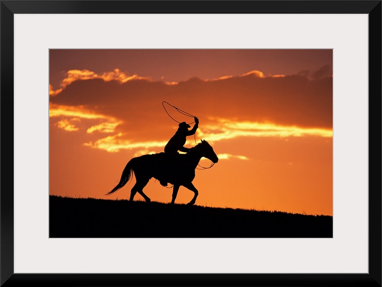 <p>The sunset sky silhouettes a cowboy on his horse as he swings his rope above his head.</p>