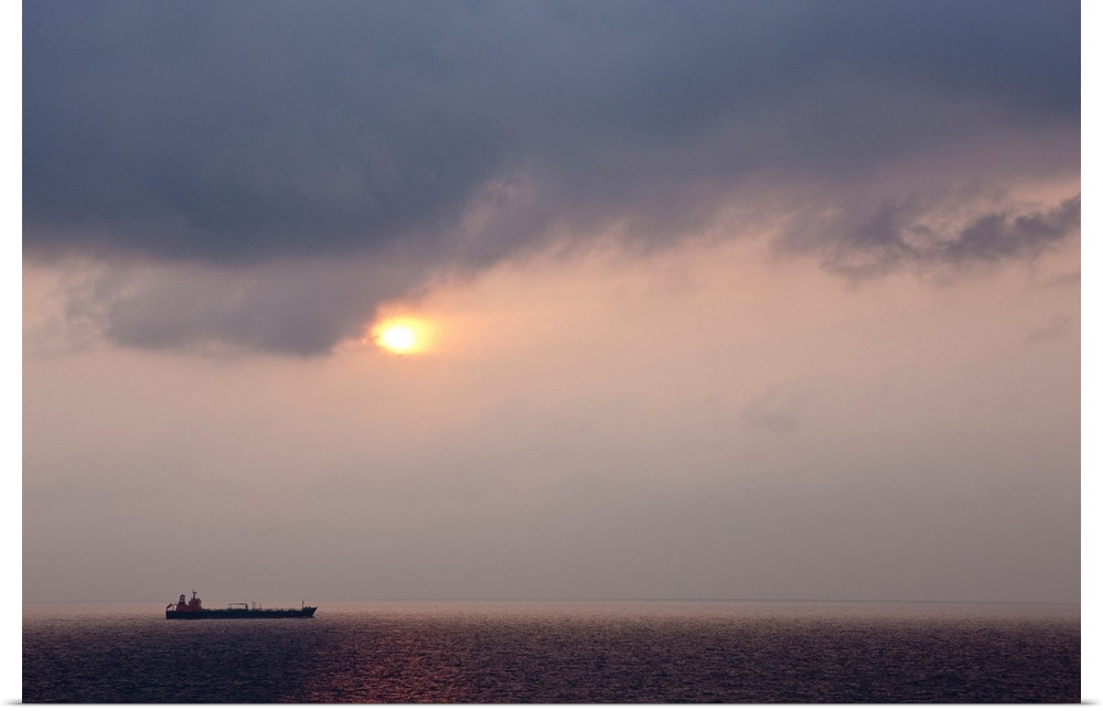 <p>Silhouette of freight boat in sea, Singapore Shipping Docks and Harbor, Singapore</p>