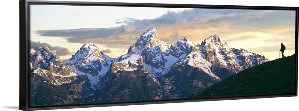<p>Silhouette of hiker looking at Teton Range from Schwabachers Landing, Grand Teton National Park, Wyoming, USA.</p>