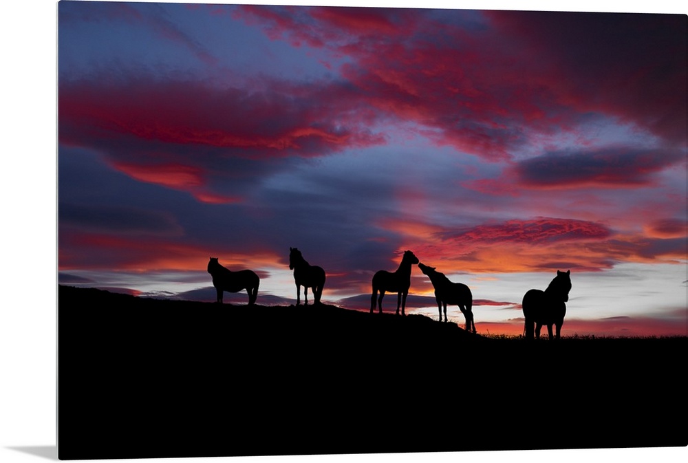 <p>Five horses stand together on the ridge of a hill at sunset in this landscape photograph.</p>
