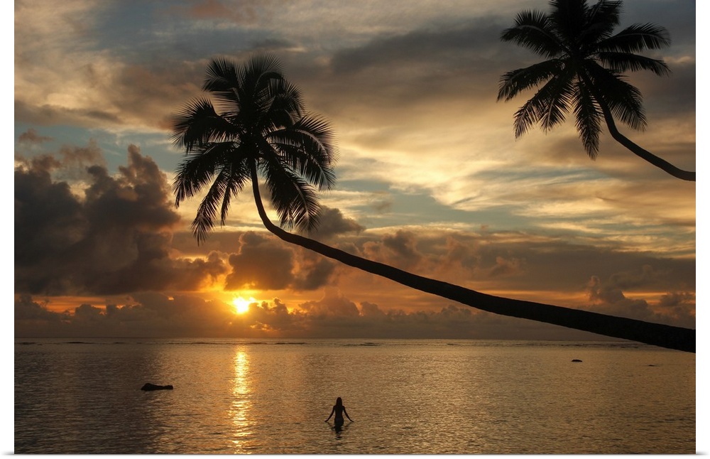 <p>Silhouette of leaning palm trees and a woman at sunrise on Taveuni Island, Fiji</p>