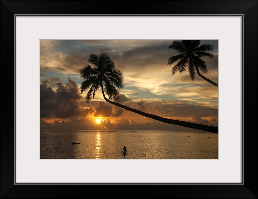 <p>Silhouette of leaning palm trees and a woman at sunrise on Taveuni Island, Fiji</p>