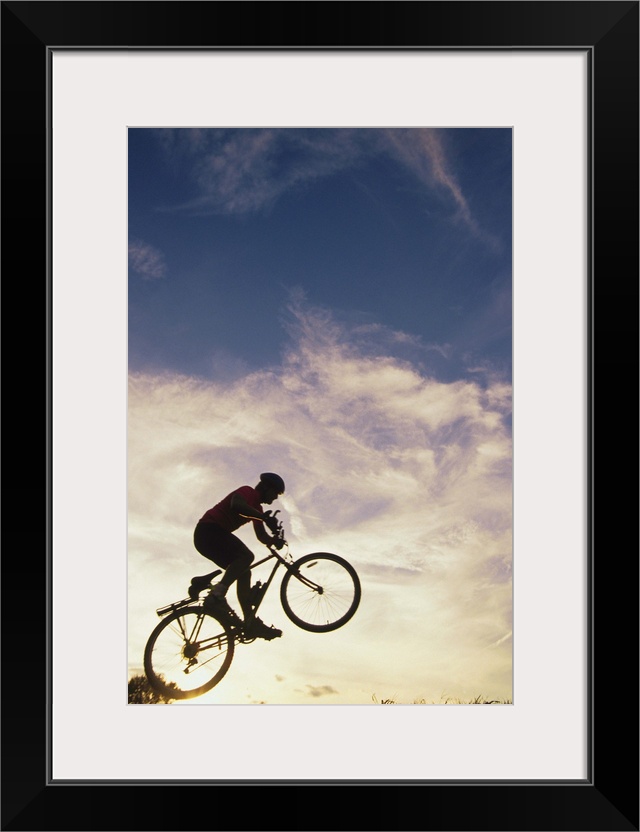 <p>Silhouette of man in mid-air on mountain bike</p>