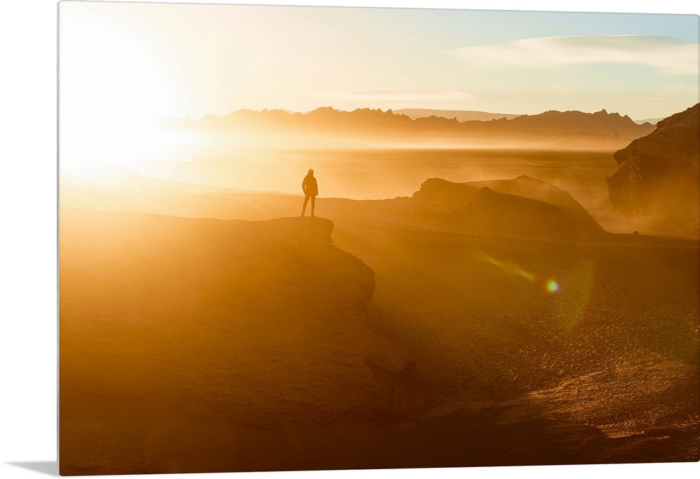 <p>Silhouette of man watching sunrise over the Labyrinth Desert, Puna, Argentina. (MR).</p>