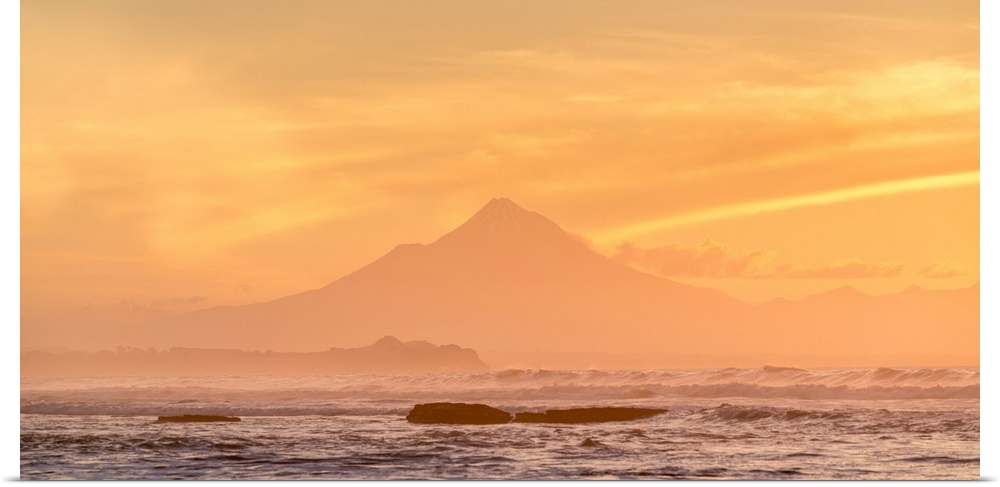 <p>Silhouette of Mount Taranaki at sunset. Tongaporutu, New Plymouth district. Taranaki region, North Island, New Zealand.</p>
