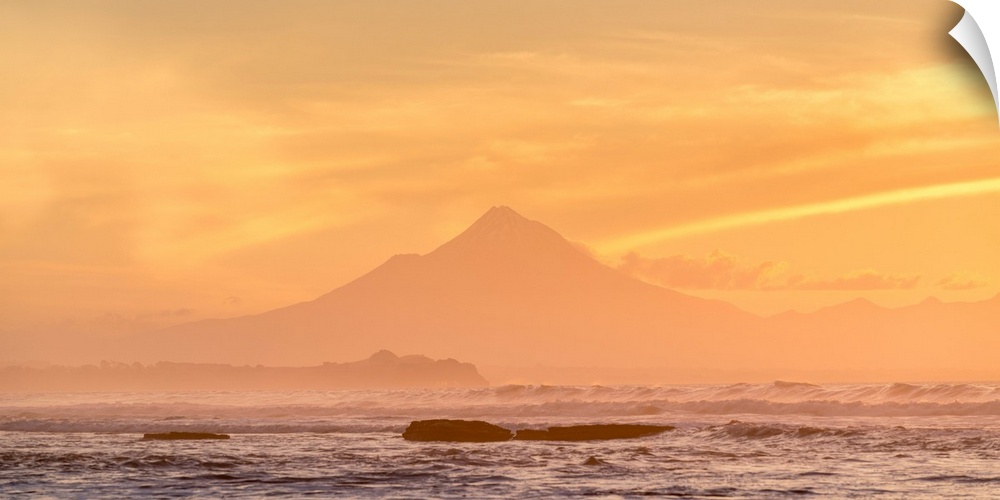 <p>Silhouette of Mount Taranaki at sunset. Tongaporutu, New Plymouth district. Taranaki region, North Island, New Zealand.</p>