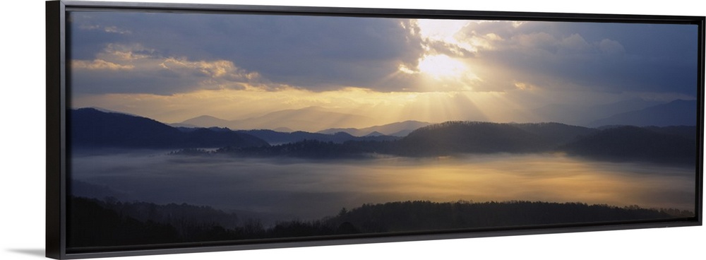 <p>Wide angle photograph of the sun rising over the mountains, and the vast landscape of the Great Smoky Mountains National Park in Tennessee.</p>