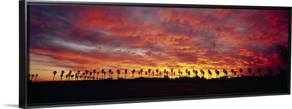 <p>Wide angle photograph of a large line of palm trees silhouetted buy the morning sun, beneath a sky of vibrant, billowing clouds.</p>