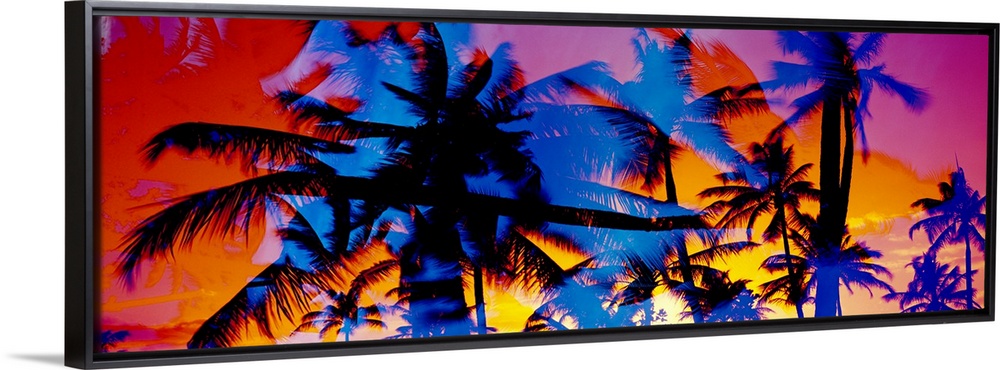 <p>Composite photo of several colored silhouettes of palm trees overlaid on each other, creating a colorful splash effect.</p>
