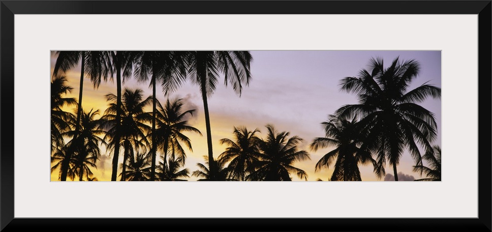 <p>A decorative wall accent of tropical trees photographed a twilight on a panoramic shaped canvas.</p>