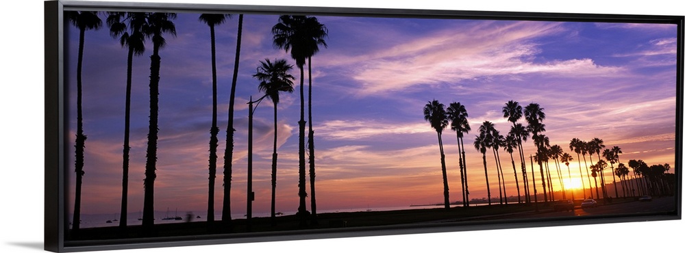 <p>Horizontal, large photograph of a line of palm trees silhouetted against the sunset, beneath a pastel sky with whipping clouds, in Santa Barbara, California.</p>