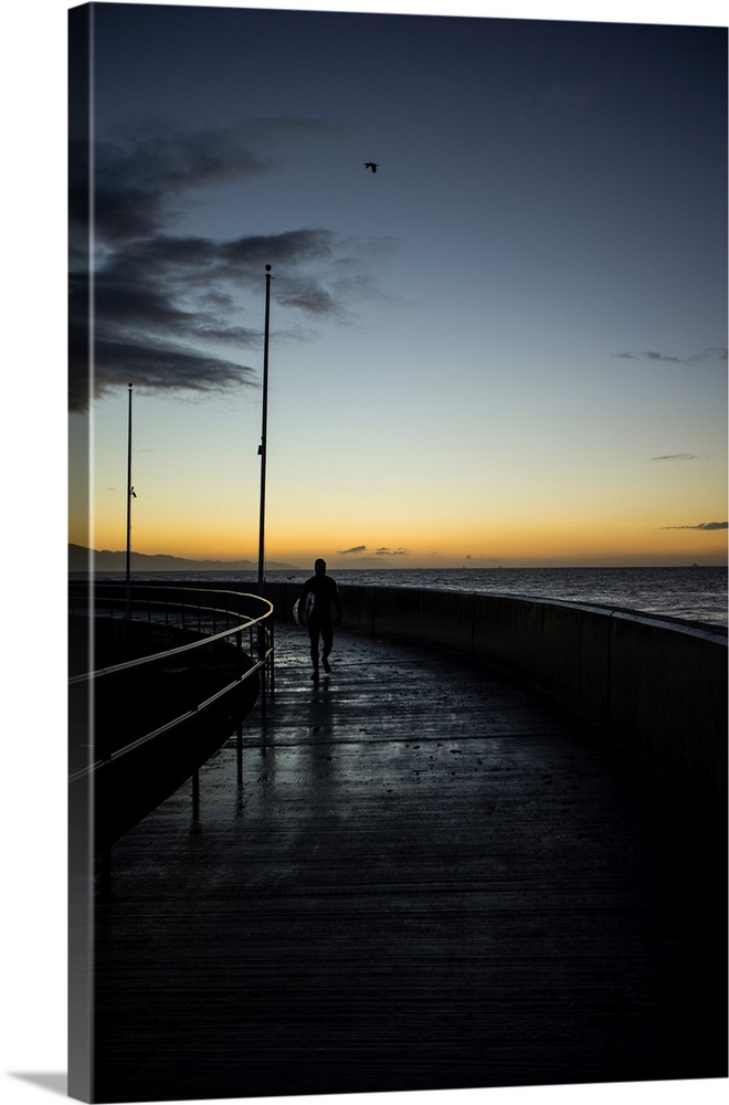 <p>Silhouette of person walking on pier, Sandspit, Santa Barbara, Santa Barbara County, California, USA</p>