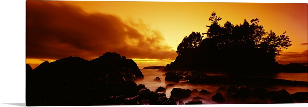 <p>Panoramic photograph displays a sunburnt sky as the sun begins to set over the profile of a rocky shoreline in North America.</p>