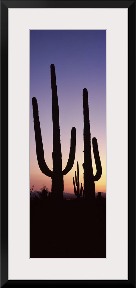 <p>Vertical panoramic photograph of cactus silhouettes in desert at sunset with mountains in the distance.</p>