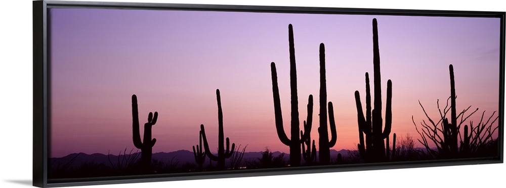 <p>Several organ pipe cactuses contrast with the pastel colored twilight sky in this panoramic, landscape photograph.</p>