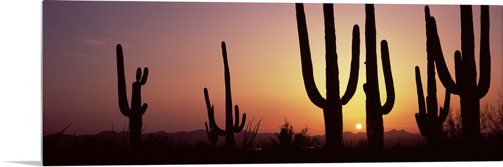<p>Panoramic photo print of cactus plants in the desert silhouetted against a setting sun.</p>